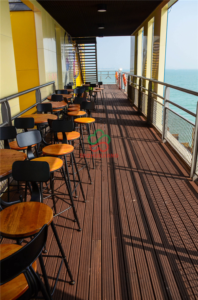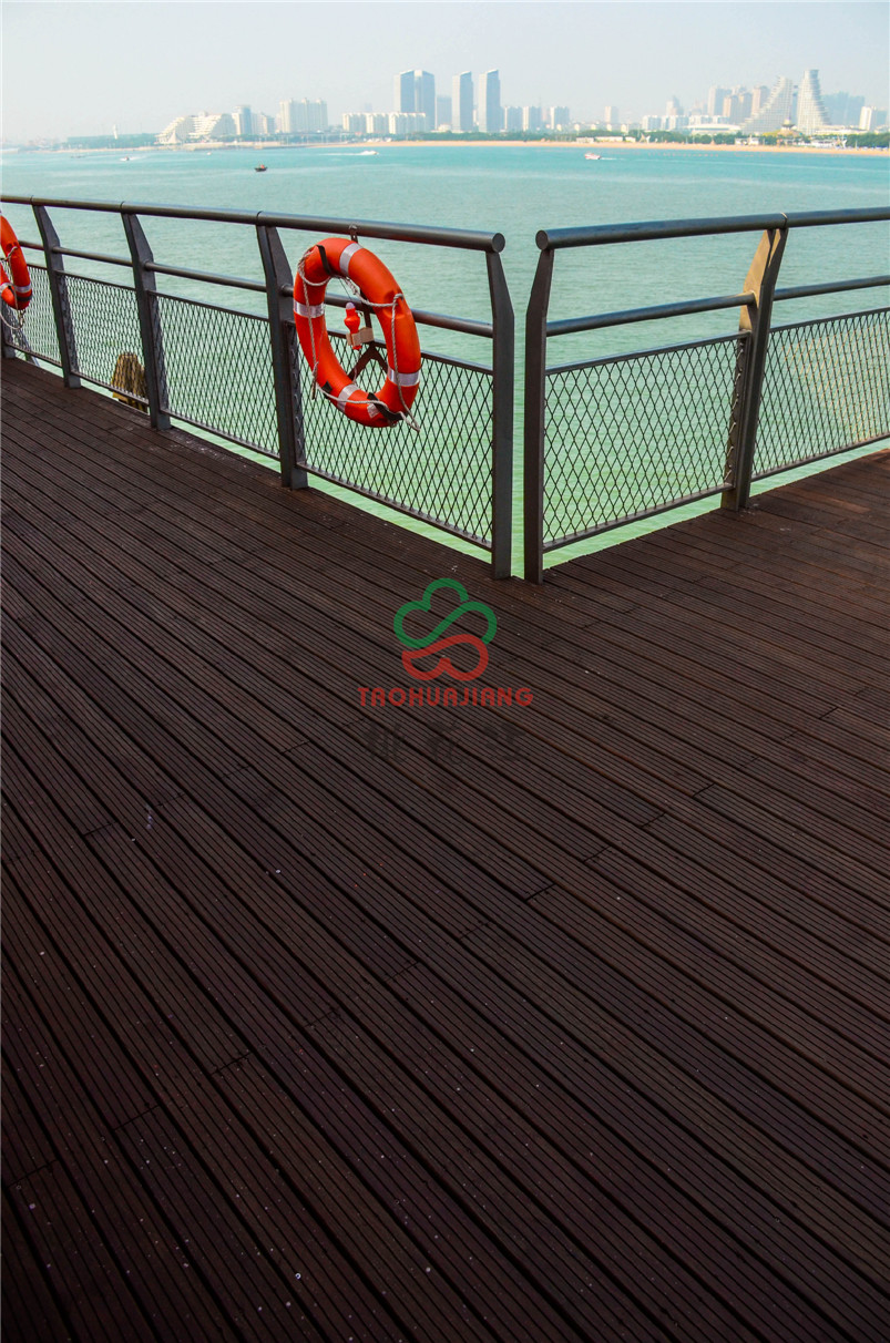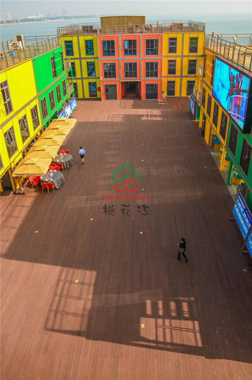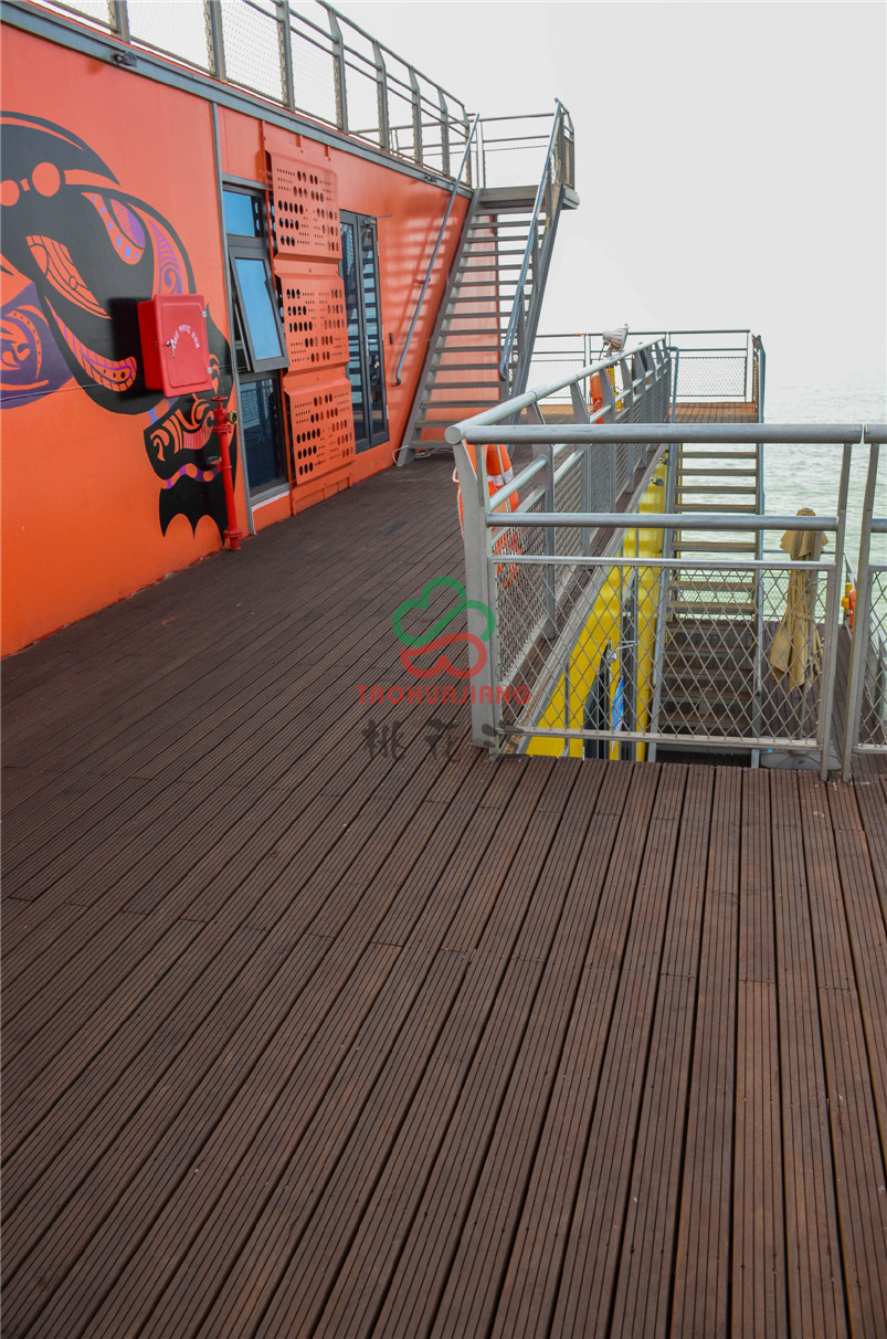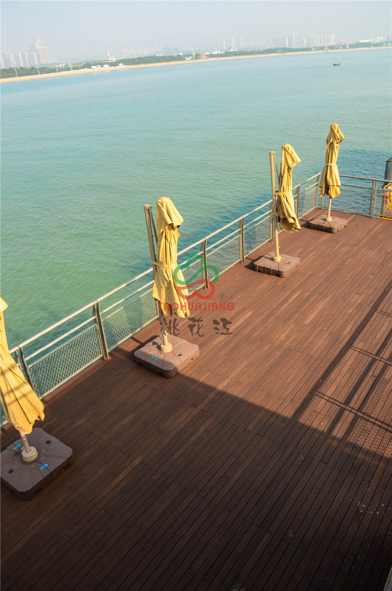 海上牧歌旅游休閑度假平臺是按照海上浮島理念設(shè)計,以海洋文化、藍色暢想為主題,通過游、娛、食、宿、賞、釣、放、賽等多種形式,打造集休閑觀光、競技垂釣、海洋采摘、食宿賞娛功能于一體的海上休閑旅游體驗平臺。該項目的甲板上全部鋪設(shè)桃花江竹材科技的戶外防腐竹地板,桃花江的戶外防腐竹地板以其優(yōu)異的環(huán)保性、耐候性和穩(wěn)定性,即使在日曬雨淋的甲板上也不動聲色,穩(wěn)定性強,甲板上同時可容納上千人,深咖色的地板與五彩斑斕的建筑形成一幅絢麗的風(fēng)景,是人們休閑娛樂觀海的極佳所在。