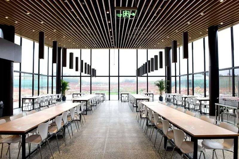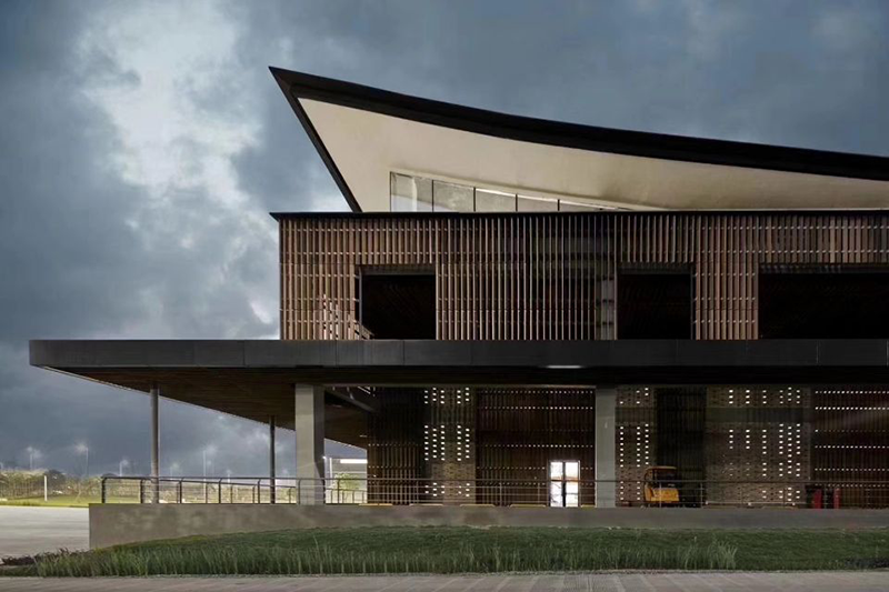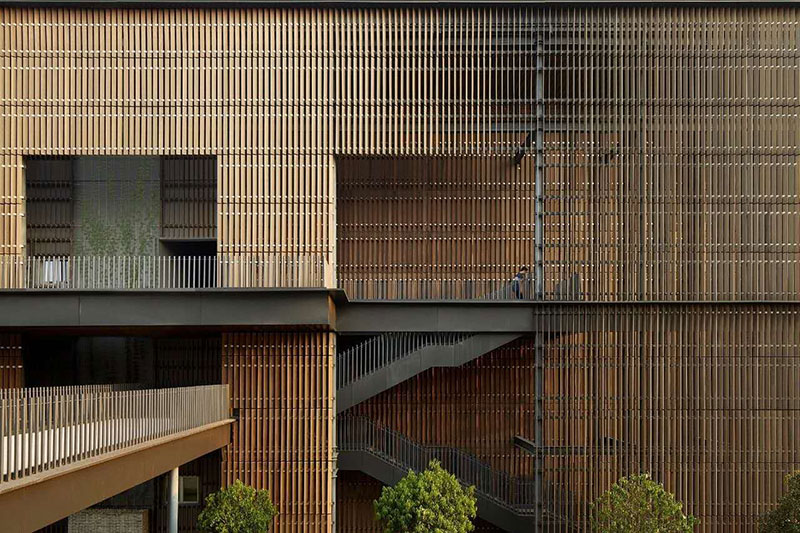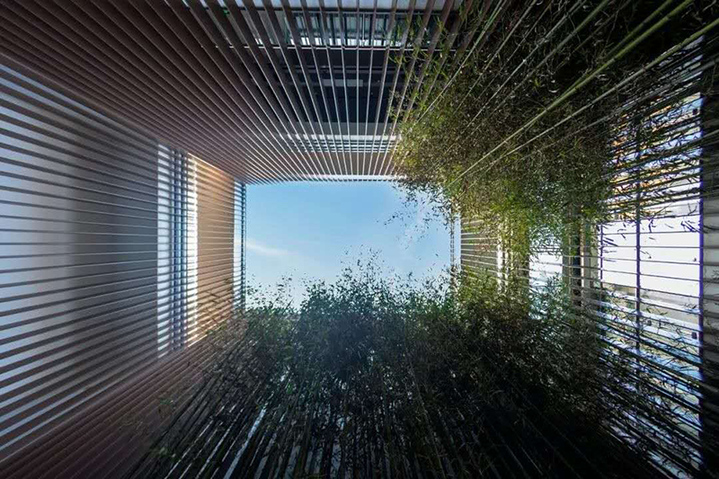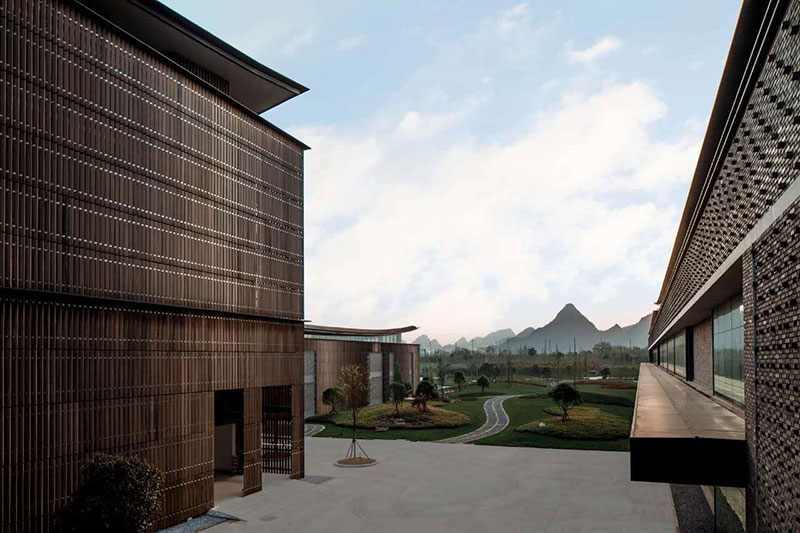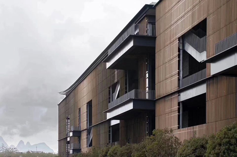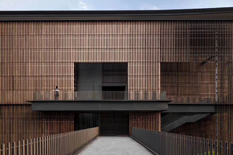 桂林溢達九美橋(又稱十如)時尚園位于桂林市象山區(qū)九美橋一帶,是香港溢達集團承債式整體重組桂林銀海紡織集團公司后實施的綠色工廠項目。項目外墻、欄桿和天花吊頂使用的環(huán)保竹木格柵兼來自于桃花江竹材,顏色厚重雅致,質(zhì)感天然,疏密有致,既美觀又充分彰顯了綠色環(huán)保、低碳節(jié)能和可持續(xù)發(fā)展的理念。