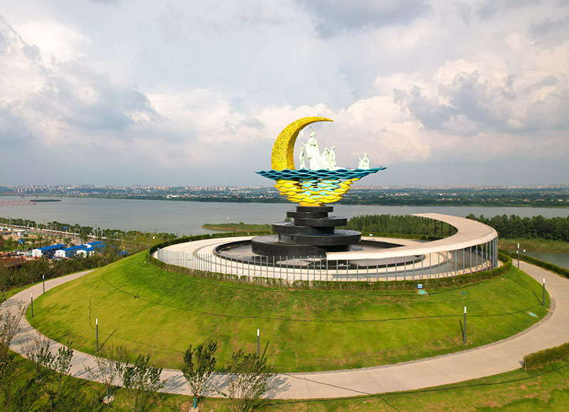 湘江女神公園坐落于長沙大王山旅游度假區(qū)內(nèi),在湘江歡樂城歡樂雪域歡樂水寨的東南方向,西臨桐溪湖,東靠湘江西岸,占地約 15 萬平米。湘江女神公園取名自楚國偉大詩人屈原的作品《九歌·湘夫人》,《九歌·湘君》的姊妹篇。公園山頂?shù)南娼竦袼苁且韵娣蛉硕鸹省⑴ⅲㄋ吹膬晌黄拮樱﹥晌慌駷樵痛蛟?,由廣州美術(shù)學(xué)院雕塑與公共藝術(shù)學(xué)院副院長團(tuán)隊(duì)設(shè)計(jì),展現(xiàn)了湘夫人攜四位侍女月夜下泛舟的場景。女神公園是在原蜂巢顏料廠(于2009年關(guān)閉)地塊進(jìn)行復(fù)綠改建的,在項(xiàng)目設(shè)計(jì)和建設(shè)時(shí),充分體現(xiàn)了海綿城市建設(shè)和綠色環(huán)保理念。公園內(nèi)沿山而建的竹木平臺(tái)、休閑坐凳和環(huán)桐溪湖的步道地板全采用廢棄后不破壞生態(tài)的桃花江高炭防腐戶外竹材。它們綠色環(huán)保,質(zhì)感天然,耐腐耐候,與周邊景觀有機(jī)融合,讓景色更美麗,讓城市更綠色。