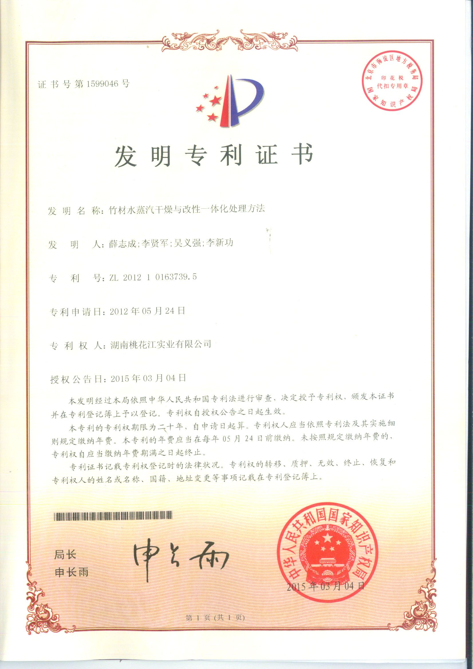 2006年,桃花江經(jīng)過(guò)多年研究,逐漸掌握了通過(guò)增加竹子的密度,同時(shí)經(jīng)過(guò)炭化和防腐的新型竹材加工技術(shù),成功解決了竹制材料不能廣泛運(yùn)用于戶外的世界性難題,獲得了竹制材料研究方面的巨大的突破。該項(xiàng)技術(shù)完美的解決了竹材戶外運(yùn)用上的防腐性、耐磨性和穩(wěn)定性問(wèn)題。這種技術(shù)被稱為“高炭防腐技術(shù)”,2006年這項(xiàng)技術(shù)已經(jīng)申請(qǐng)發(fā)明專利,是我國(guó)戶外竹材研究領(lǐng)域的首個(gè)個(gè)發(fā)明專利,故桃花江竹材科技被譽(yù)為是我國(guó)竹材領(lǐng)域“高炭防腐的發(fā)明者”。此后桃花江竹材科技進(jìn)行了大量的相關(guān)的實(shí)驗(yàn)室檢測(cè)和實(shí)際測(cè)試,結(jié)果證明,高炭防腐技術(shù)是目前唯一可以讓竹子戶外應(yīng)用的解決辦法。未經(jīng)處理過(guò)的竹子,耐久性等級(jí)為5級(jí)(EN350標(biāo)準(zhǔn)),耐久性不夠。經(jīng)過(guò)熱高炭防腐技術(shù)處理后的竹子,尺寸可進(jìn)行定制,材料穩(wěn)定性提高了50%左右。耐久性也從原來(lái)的5級(jí)提高到最高等級(jí)1級(jí)(EN350-1標(biāo)準(zhǔn)1級(jí),ENV807標(biāo)準(zhǔn)1級(jí),EN113標(biāo)準(zhǔn)1級(jí))經(jīng)過(guò)熱處理的竹子同時(shí)可以有效地抵抗淺表真菌。(EN152標(biāo)準(zhǔn)0級(jí))桃花江高炭防腐戶外地板,使用風(fēng)險(xiǎn)等級(jí)達(dá)到4級(jí)(標(biāo)準(zhǔn)EN335)是市場(chǎng)上唯一達(dá)到此標(biāo)準(zhǔn)的竹產(chǎn)品。
